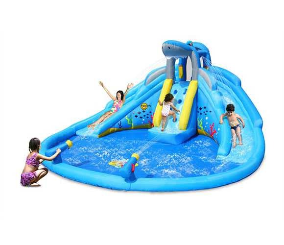 מתקן מים מתנפח לחצר, הכולל שתי מגלשות מים ושני תותחי מים – דגם “בריכת הכריש 9421” – חדש